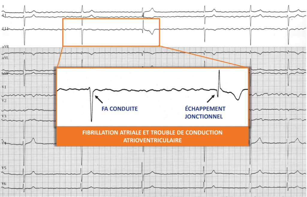 Ce patient présente donc une FA lente. Lors d’un épisode de FA en présence d’une conduction atrio-ventriculaire préservée, le rythme ventriculaire est irrégulier, rapide et supérieur à 100 bpm même si il reste bien inférieur à celui des oreillettes. Il existe en effet un “bloc” fonctionnel au niveau de la jonction en raison de la durée de la période réfractaire du nœud auriculo-ventriculaire. Il existe toutefois certaines particularités à connaitre. La fréquence ventriculaire peut être très ralentie comme chez ce patient avec un rythme pouvant être inférieur à 40 bpm. Une bradycardie ventriculaire régulière suggère l’existence d’un BAV complet avec interruption totale de la conduction et échappement le plus souvent jonctionnel. Un rythme ventriculaire restant irrégulier est plutôt en faveur d’une conduction très altérée mais toujours présente.