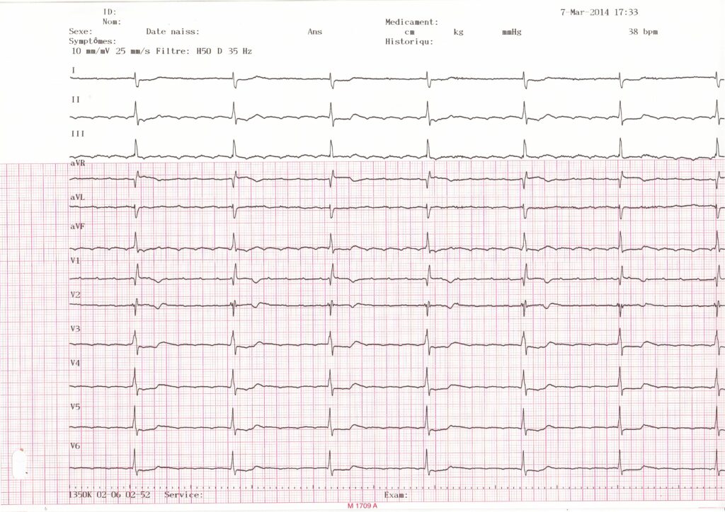 Ce tracé montre une bradycardie avec une fréquence ventriculaire à 40 bpm; aspect de flutter atrial commun (dents de scie dans les dérivations inférieures, activité atriale positive en V1 et négative en V6); bloc de branche droit incomplet; les complexes QRS sont lents et réguliers correspondant à une conduction atrio-ventriculaire altérée (absence de rapport fixe entre activités atriales et activités ventriculaires);