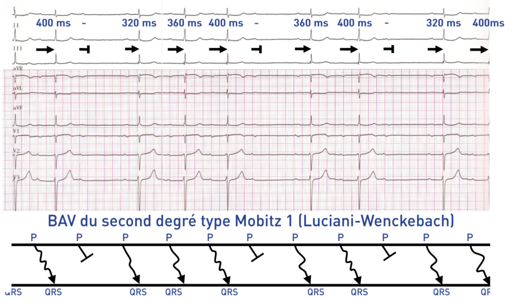 Activité atriale sinusale et aspect de bloc auriculo-ventriculaire du second degré type Luciani-Wenckebach;