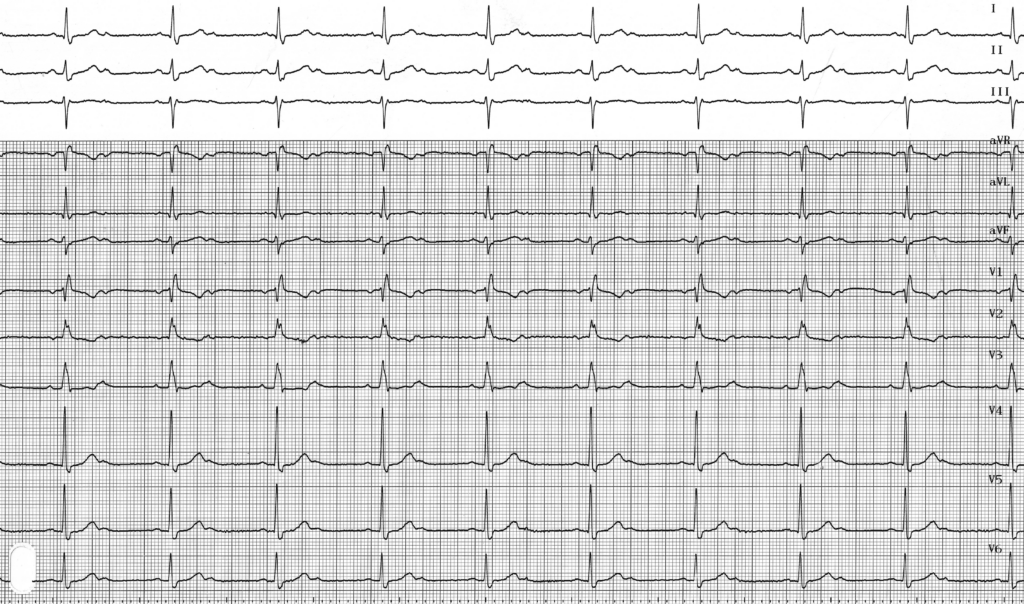 Activité sinusale régulière; 1 onde P sur 2 est bloquée: aspect de BAV du second degré type 2/1; QRS large avec axe gauche: aspect de bloc de branche droit avec hémibloc antérieur gauche;