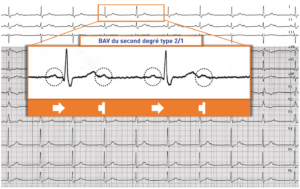 Le BAV 2/1 mérite d’être individualisé parce qu’il est relativement fréquent et qu’il représente la limite entre bloc du second degré et bloc de haut grade puisqu’il comporte autant d’ondes P bloquées que d’ondes P conduites. Il est difficile de déterminer le siège supra-, intra- ou infra-hisien. L’enregistrement de tracés longs peut permettre de révéler un aspect de Luciani-Wenckebach typique avec variations de la durée de l’espace PR (en faveur d’un Mobitz 1 nodal) ou un aspect de Mobitz 2 avec plusieurs ondes P conduites suivies d’une onde P bloquée sans modification de l’espace PR (en faveur d’un bloc intra- ou infra-hisien).