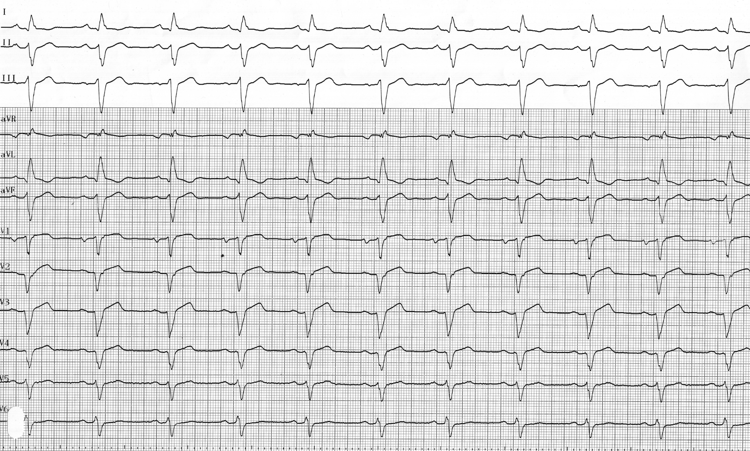 Chez ce patient, l’électrocardiogramme correspond à un aspect d’hémibloc antérieur gauche “élargi”: axe gauche, aspect qR en DI, rS en DII, DIII, ondes q et rabotage onde R dans les précordiales droites, onde S large en V6.