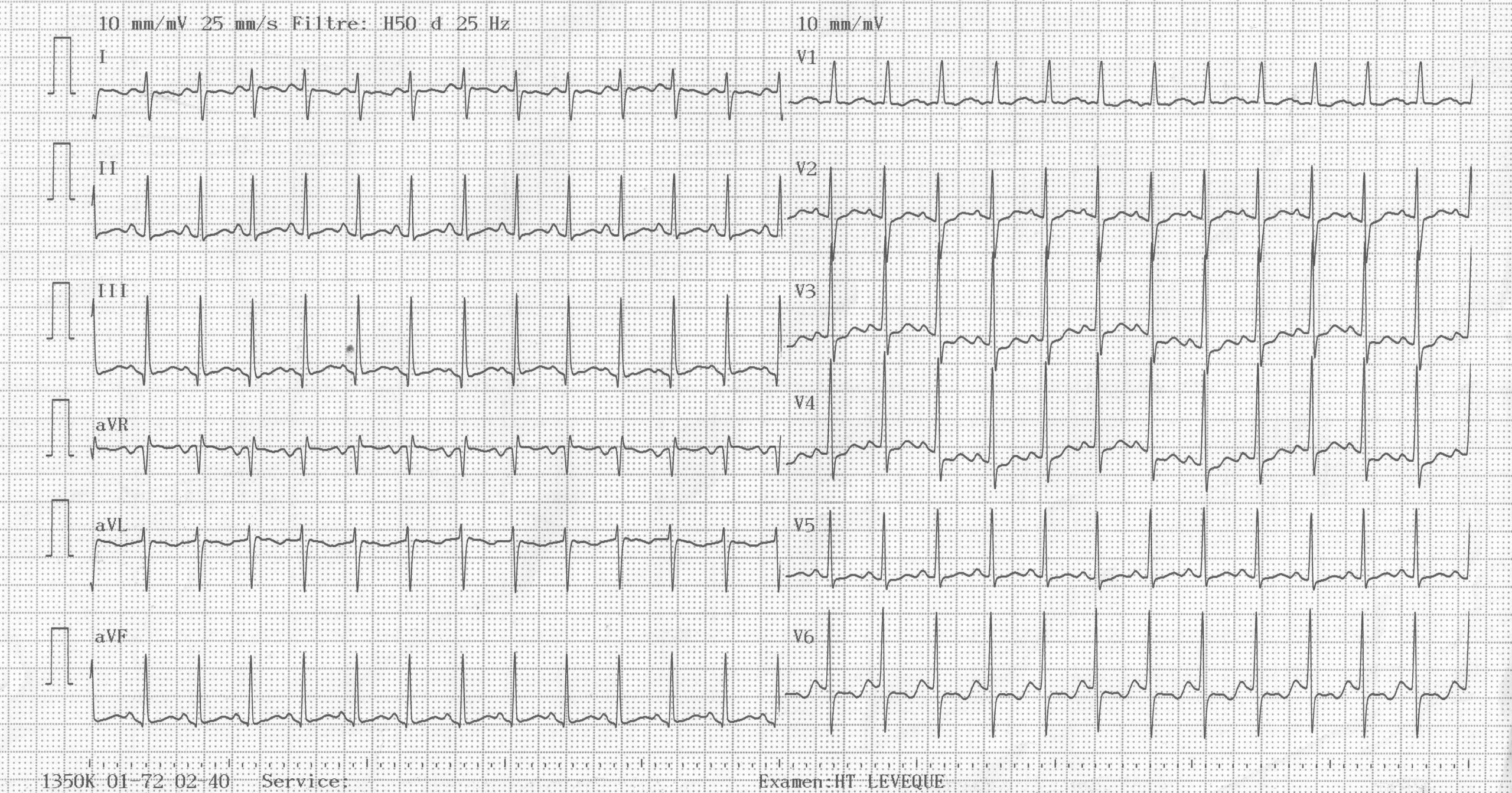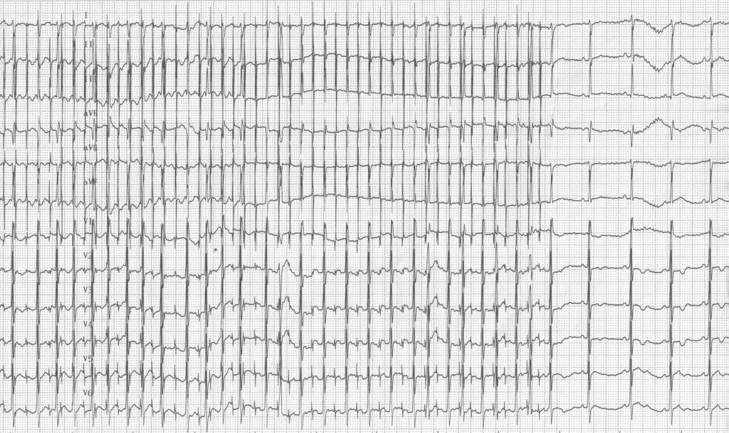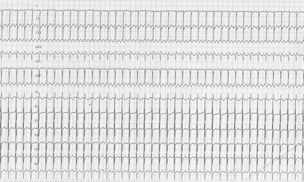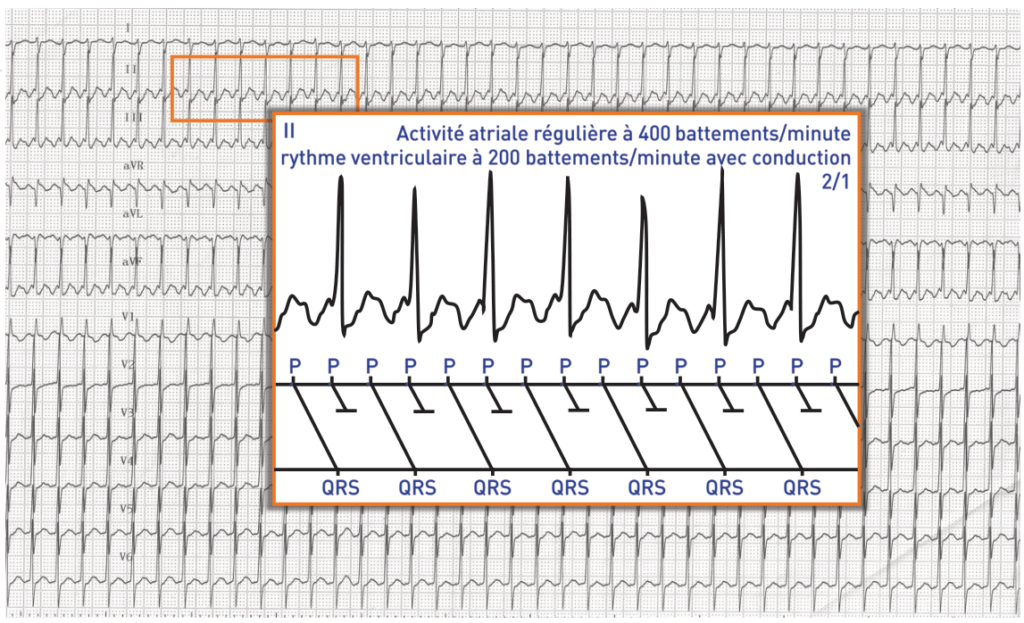 Rythme non sinusal ; tachycardie à 200 battements/minute ; aspect de flutter commun avec activité atriale régulière à 400 battements/minute ; aspect caractéristique en dents de scie dans les dérivations inférieures ; rythme ventriculaire à 200 battements/minute avec conduction 2/1 ;