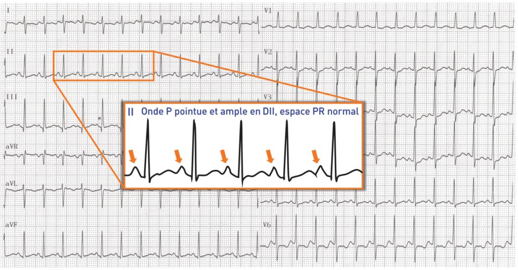 on peut noter certaines spécificités sur l’électrocardiogramme : l’hypertrophie ventriculaire droite est généralement moins nette, avec des complexes R ou Rs observés dans les précordiales droites et une négativité prédominante dans les dérivations gauches (complexe rS) ; on peut parfois observer une hypertrophie ventriculaire gauche associée suspectée sur la présence d’ondes q profondes ou d’ondes T négatives dans les dérivations précordiales gauches ;