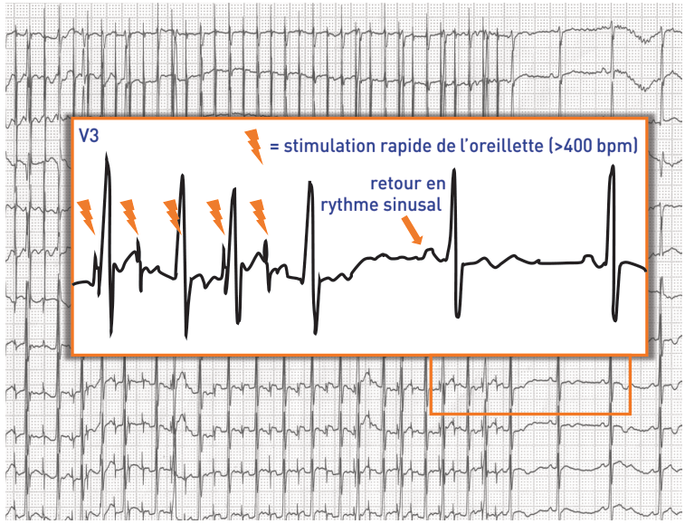 À la suite de la chirurgie, des électrodes temporaires ont été laissées en place sur le massif auriculaire ; une stimulation rapide de l’oreillette (stimuli à plus de 400 battements/minute) permet d’obtenir un retour en rythme sinusal ;