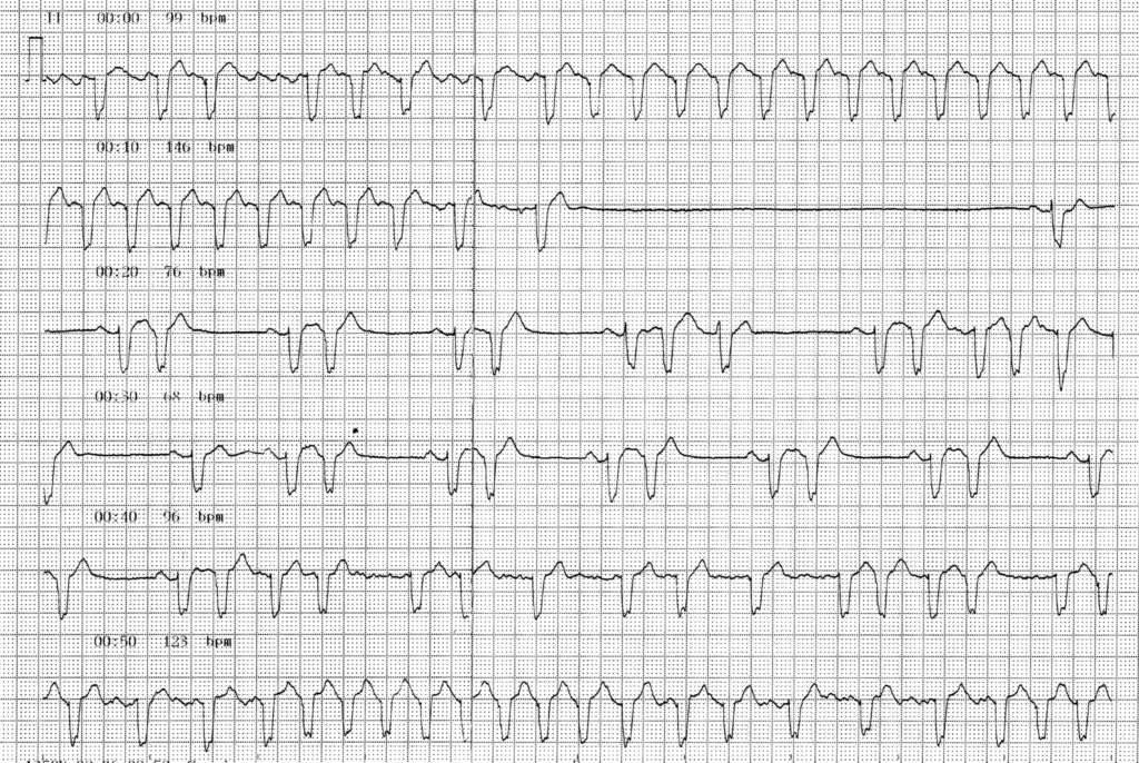 Homme de 87 ans avec myocardiopathie ischémique et bloc de branche gauche; hospitali sation dans le cadre de syncopes répétées; Enregistrement d’un tracé long (dérivation DII sur 1 minute); le patient présente une li pothymie durant l’enregistrement du tracé