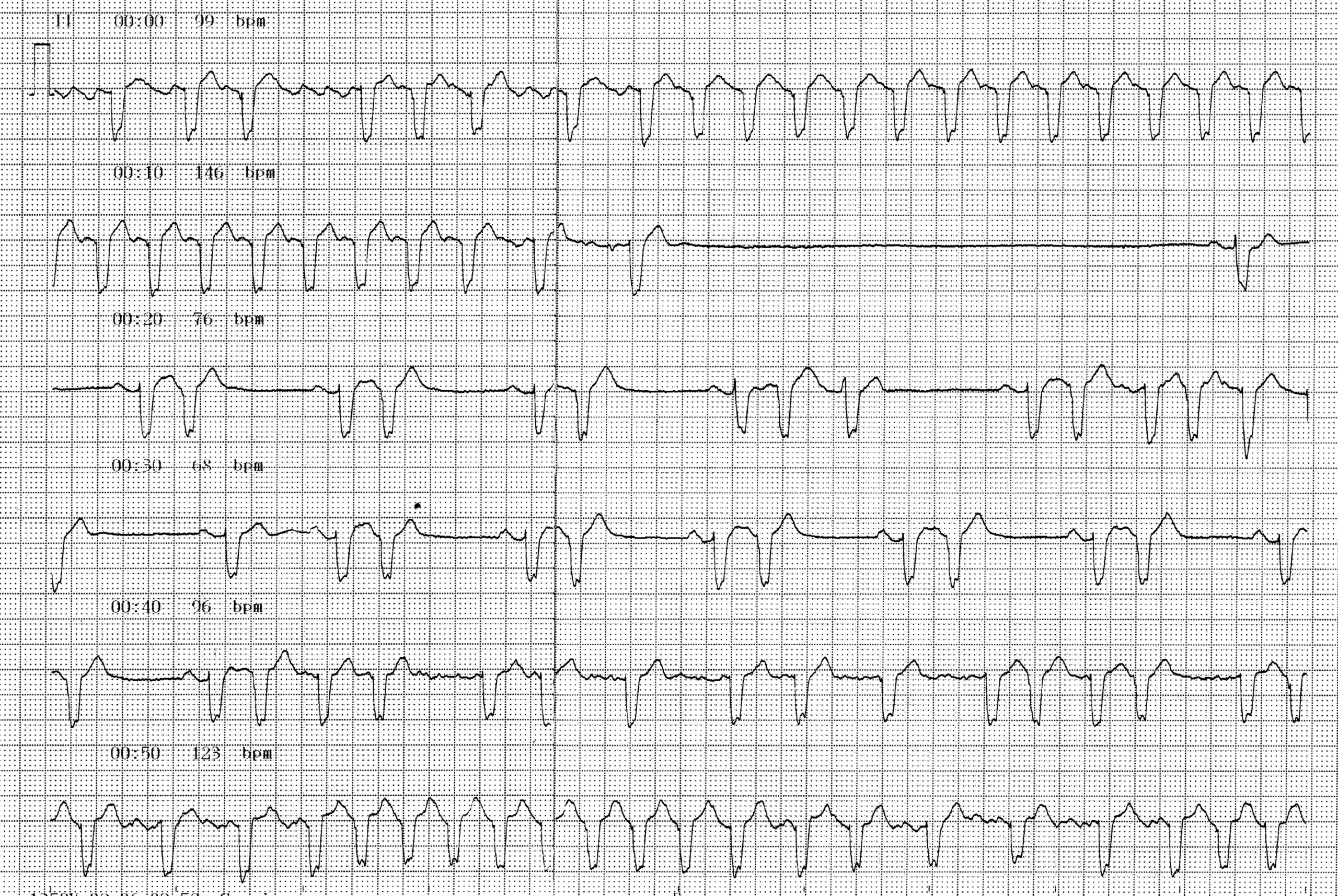 Cet enregistrement DII long permet de mettre en évidence un certain nombre d’éléments: 1) initialement, on observe un probable flutter atrial (aspect en dents de scie) avec conduction variable et bloc de branche gauche; 2) le flutter atrial se réduit avec existence d’une pause sinusale post- réductionnelle de 5 secondes; 3) existence d’extrasystoles atriales prématurées avec aspect P/T; 4) redémarrage de l’arythmie atriale;