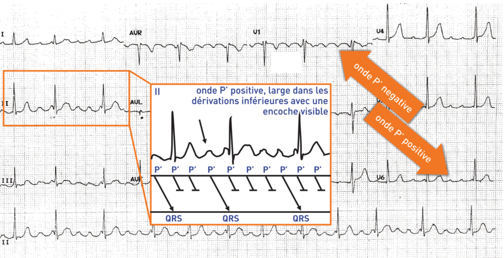 Rythme ventriculaire irrégulier; mise en évidence d’une activité atriale rapide, régulière et monomorphe à 220 bpm; la morphologie ne correspond pas à celle d’un flutter commun antihoraire; l’onde de dépolarisation atriale est positive, large dans les dérivations inférieures avec une encoche visible en DII, DIII mais également en aVR; l’activité atriale est négative en V1 et positive en V6; il s’agit donc d’un flutter atrial horaire de l’oreillette droite