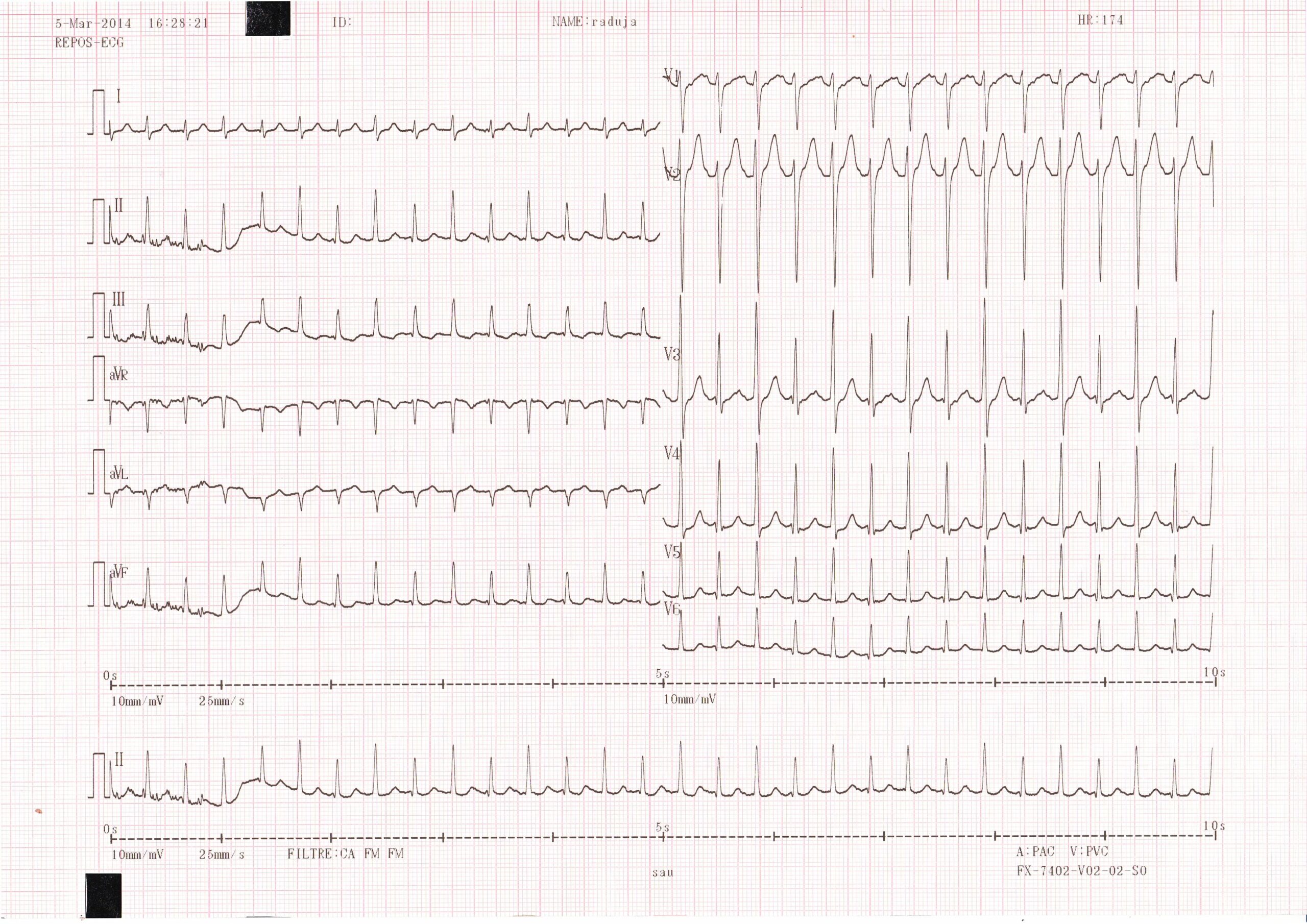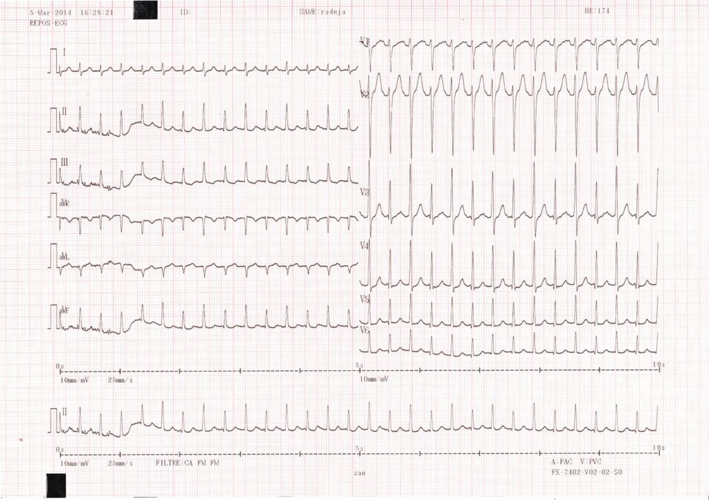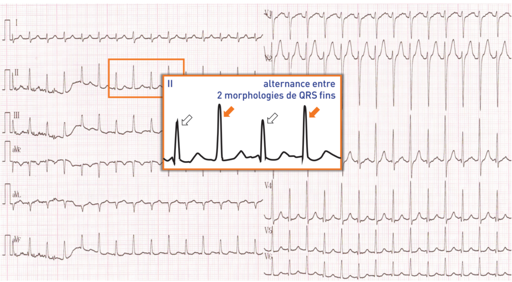 Ce tracé montre une tachycardie régulière à 170 bpm; les QRS sont fins permettant d’éliminer le diagnostic de tachycardie ventriculaire; à noter une alternance entre 2 morphologies de QRS fins (axes identiques mais amplitudes différentes); l’activité atriale est difficile à identifier rendant difficile la différenciation entre une tachycardie atriale et une tachycardie jonctionnelle (réentrée intranodale ou réentrée sur voie accessoire);