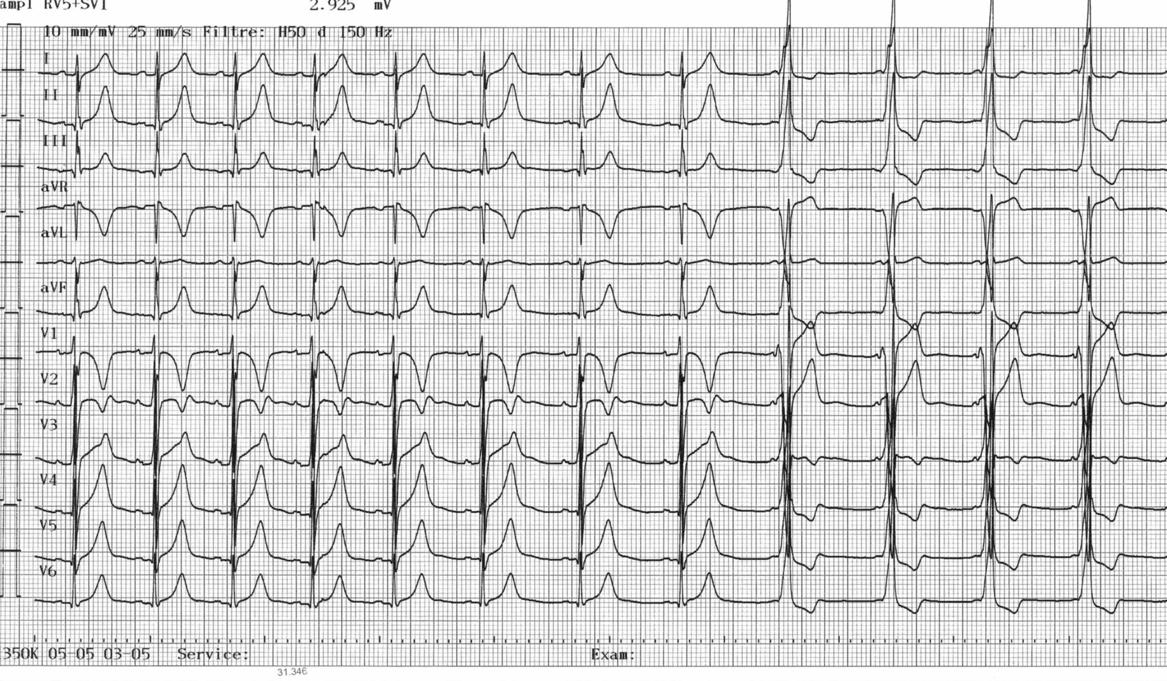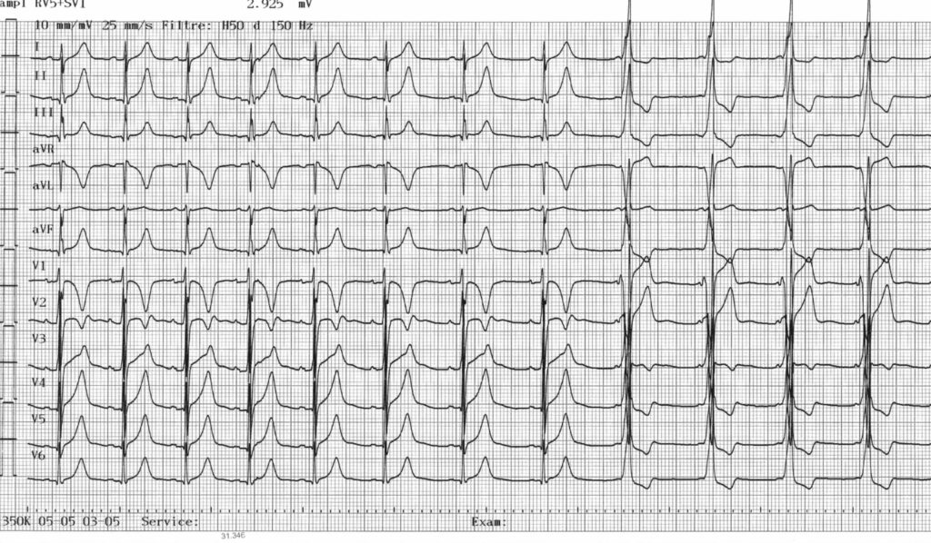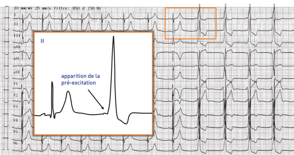 Dans la partie initiale du tracé, on retrouve un rythme sinusal avec un espace PR normal, un QRS fin (présence d’une onde q septale en V6) et des troubles de la repolarisation aspécifiques; à la faveur d’un léger ralentissement de la fréquence cardiaque, apparition d’une pré-excitation ventriculaire avec PR court, onde delta et troubles de la repolarisation; le sous-décalage du segment ST et l’inversion de l’onde T quasi-systématique dans toutes les dérivations par rapport au tracé initial peuvent être imputés à la modification d’activation et à l’apparition de la pré-excitation;