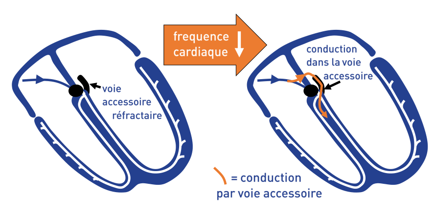 La conduction dans un faisceau de Kent se fait selon la loi du tout ou rien. La dangerosité de ce type de voie accessoire réside dans l’existence d’une période réfractaire courte. Un aspect intermittent en rythme sinusal (apparition lors d’une bradycardie) est en faveur d’une période réfractaire longue et d’un caractère bénin.