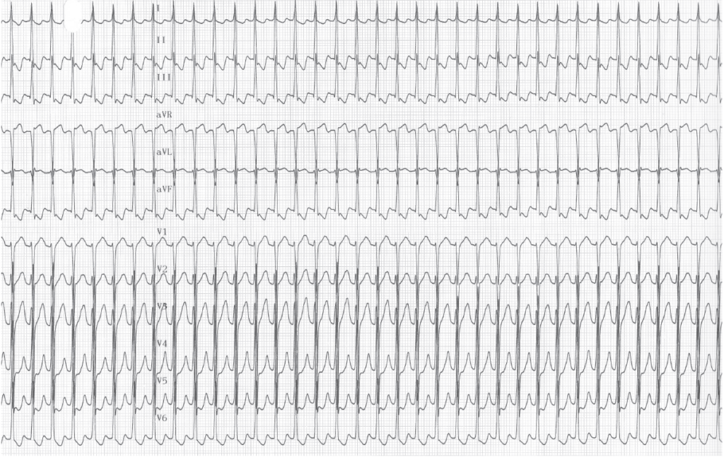 Tachycardie régulière, à 180 bpm, QRS fins; activité atriale difficile à visualiser mais semblant présente dans l’onde T avec un rapport 1/1;