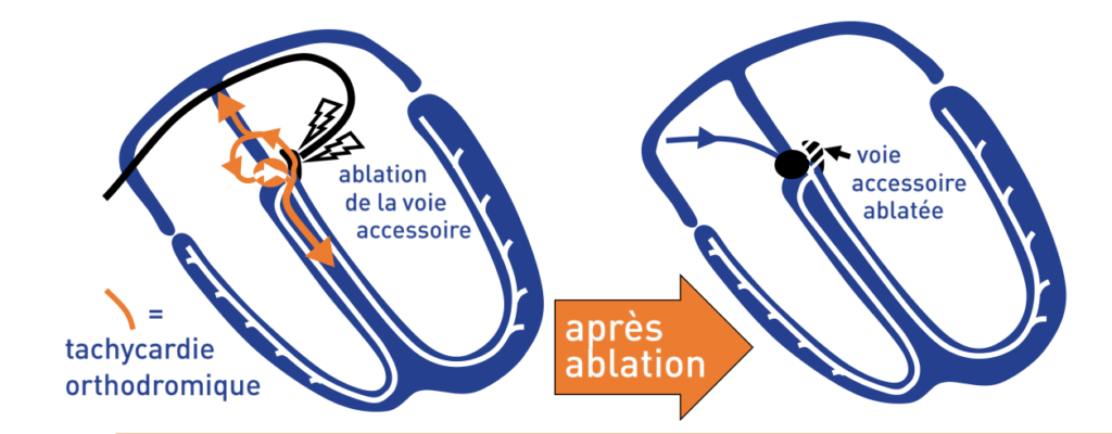 Dans une tachycardie orthodromique, l’influx descend de l’oreillette au ventricule par le faisceau de His et remonte par le faisceau de Kent; la tachycardie est régulière, à début et fin brutal, avec un rapport A/V en 1/1, l’espace P’R étant plus long que l’espace RP’;