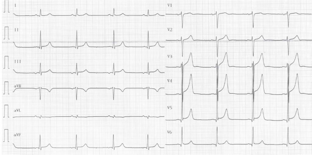 Électrocardiogramme réalisé après ablation d’une voie accessoire; disparition de la pré-excitation, PR normal et mise en évidence d’une onde q septale en V5-V6 physiologique; repolarisation précoce;