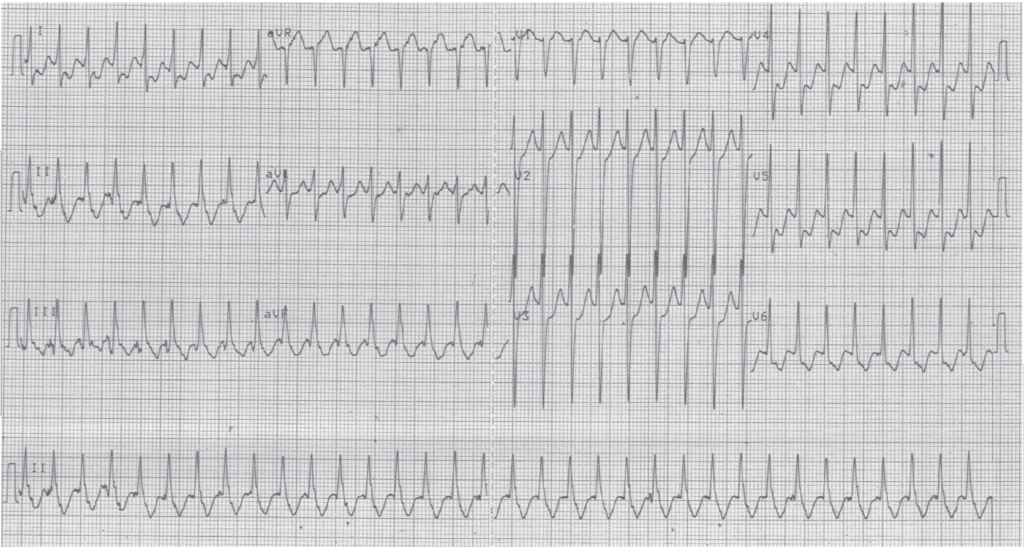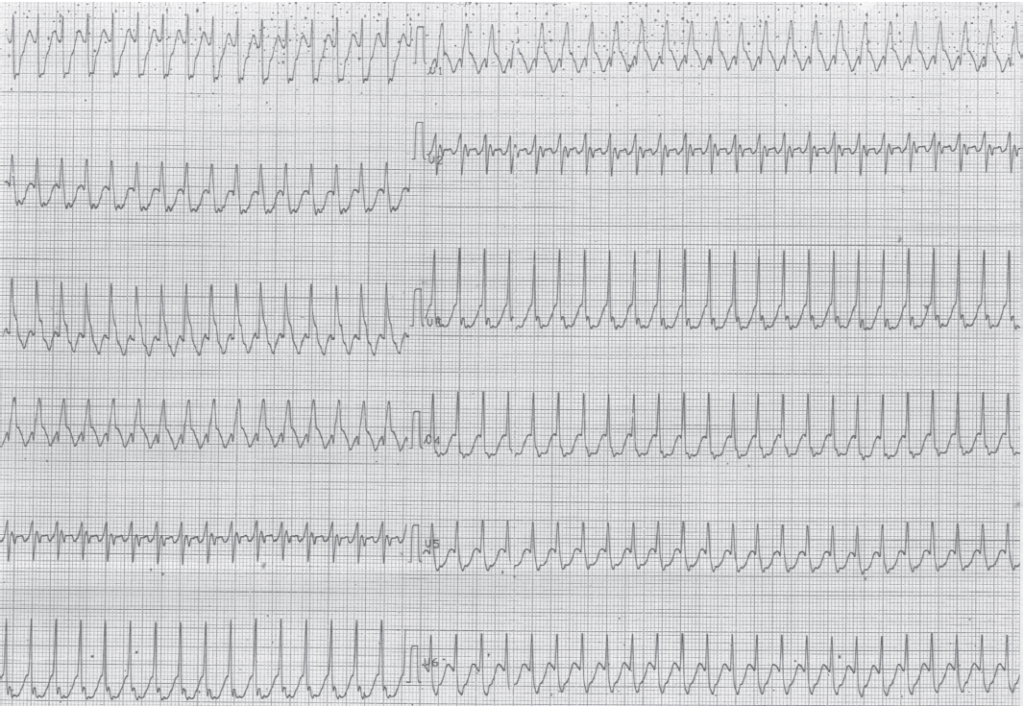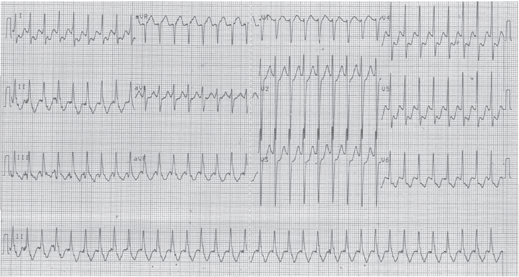 Tracé enregistré quelques minutes après le premier; tachycardie 1/1 entre oreillettes et ventricules avec QRS large (aspect de bloc de branche droit); cycles RR identiques au premier tracé (300 ms);