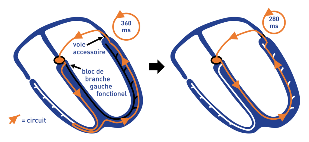 Ce patient présentait des épisodes répétés de tachycardie orthodromique sur voie accessoire latérale gauche cachée. Différents éléments permettent d’arriver à ce diagnostic: 1) la voie accessoire n’était pas identifiable sur l’électrocardiogramme en rythme sinusal; 2) ce patient présentait différents épisodes de tachycardie réciproque avec les 2 types d’aberration de conduction (bloc de branche droit ou bloc de branche gauche fonctionnel). Il est relativement fréquent qu’au début d’une tachycardie apparaisse pendant quelques complexes une aberration de conduction qui disparait ensuite (adaptation des périodes réfractaires de la branche boquée ou disparition de la conduction rétrograde cachée de branche en branche entretenant le bloc de branche). Si la disparition de ce bloc de branche entraine une accélération de la tachycardie, cela signe l’existence d’un faisceau de Kent du côté de la branche dont le bloc est ralentisseur. Chez ce patient, le bloc de branche droit ne modifiait pas la fréquence de la tachycardie (cycles RR identiques) au contraire du bloc de branche gauche qui allongeait les cycles RR de 30 ms environ. L’allongement du cycle de la tachycardie est secondaire à l’allongement de la longueur du circuit dans sa portion ventriculaire (dépolarisation ventriculaire ralentie en rapport à la conduction musculaire caractéristique d’un bloc de branche). L’allongement des cycles RR est souvent net quand la voie accessoire est de topographie latérale, il est moindre quand elle est septale. Il est à noter toutefois que l’allongement du délai ventriculo-atrial peut être compensé par une réduction du temps de conduction nodale (AH) favorisée par la survenue de ce délai. Le résultat final est donc une diminution de la fréquence de la tachycardie, moins importante que celle entrainée par la modification du temps de conduction ventriculo-atriale; 3) le diagnostic de faisceau de Kent latéral gauche est conforté par l’existence d’une onde P’ négative en DI et aVL. En effet, durant la tachycardie, une onde P’ négative en DI traduit l’excitation de l’oreillette à partir d’une connexion latérale gauche. La déflexion auriculaire est négative car la paroi auriculaire latérale gauche est dépolarisée avant le septum, l’oreillette gauche avant la droite, le vecteur d’activation auriculaire se dirigeant en bas et à droite.