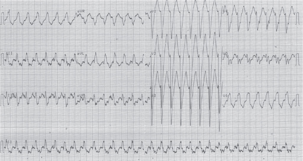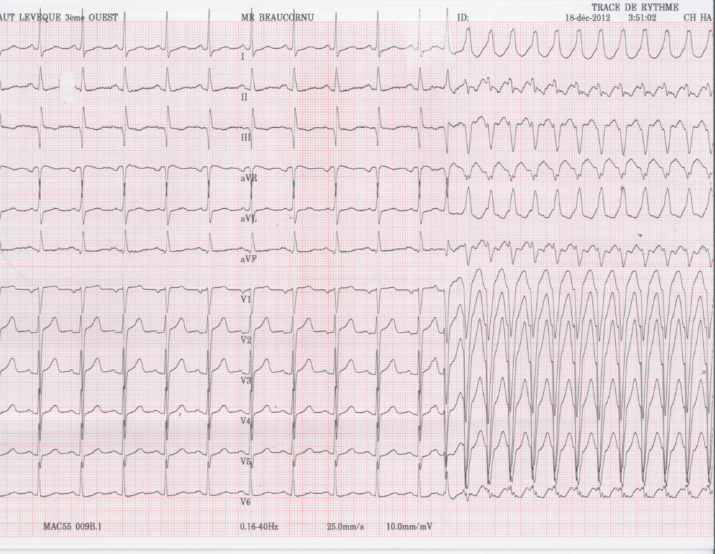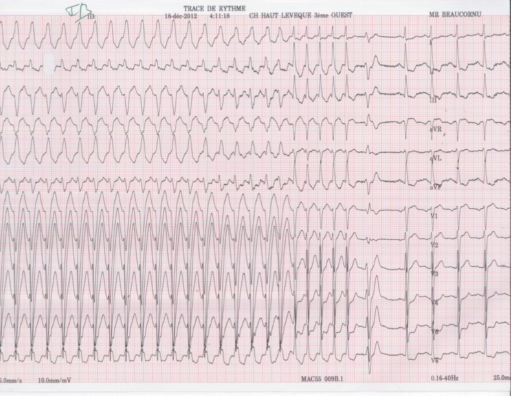Enregistrement d’un arrêt de la tachycardie; aspect de bloc de branche gauche puis accélération du rythme contemporain de l’affinement du QRS puis réduction;