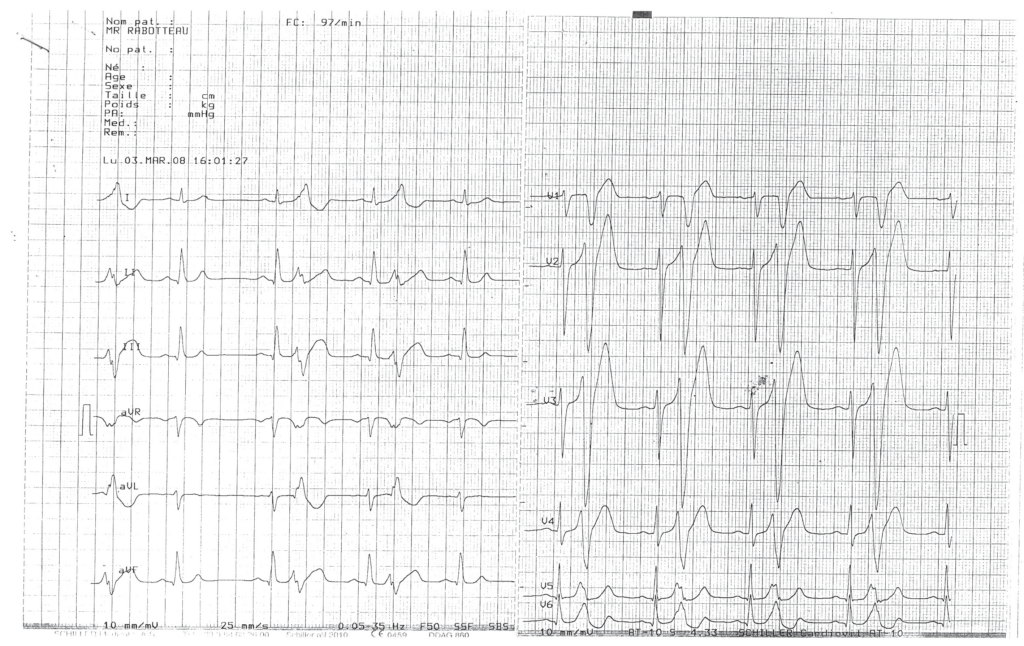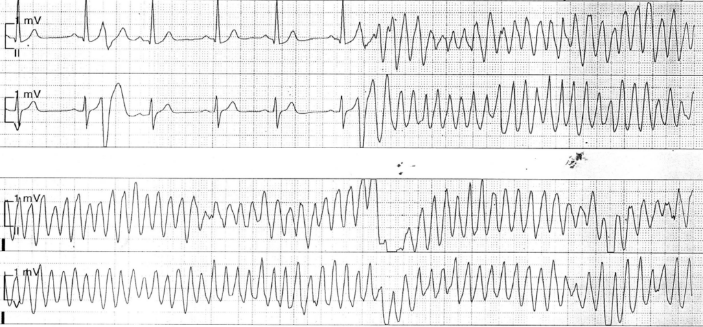 Suivi télémétrique et tracé enregistré au cours d’un arrêt cardiocirculatoire nécessitant un choc électrique en urgence; extrasystole ventriculaire identique au tracé précédent faisant dégénérer le rythme en fibrillation ventriculaire;