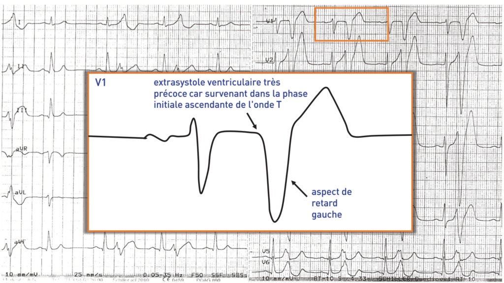 L’aspect retrouvé sur ce tracé correspond à une extrasystolie extrêmement précoce, provenant du réseau de Purkinje ventriculaire droit distal engendrant une fibrillation ventriculaire. Le réseau de Purkinje chemine dans l’endocarde et se divise en une branche fine ventriculaire droite et 2 branches plus épaisses ventriculaires gauches avec de nombreuses ramifications ce qui permet une activation rapide de la masse ventriculaire. Il existe aujourd’hui un certain nombre d’études démontrant le rôle central du réseau de Purkinje dans la genèse et l’entretien des fibrillations ventriculaires conduisant à la mort subite. Le caractère arythmogène des cellules du réseau de Purkinje réside dans une sensibilité plus importante aux post- dépolarisations précoces par rapport aux cellules myocardiques environnantes. L’aspect des extrasystoles provenant du Purkinje ventriculaire droit est relativement homogène alors qu’il est plus variable pour le Purkinje ventriculaire gauche en rapport avec une arborisation plus riche et plus complexe. Lors d’une exploration électrophysiologique, un potentiel caractéristique peut être enregistré au niveau du réseau de Purkinje responsable de l’arythmie; il constitue la cible privilégiée des procédures d’ablation.