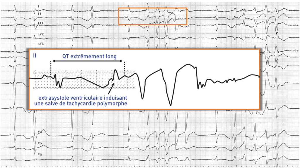Différentes classes médicamenteuses à visée cardiologique (antiarythmiques) ou pas (psychotropes, antibiotiques, antihistaminiques …) peuvent induire un allongement de l’intervalle QT pouvant favoriser la survenue d’une torsade de pointes.