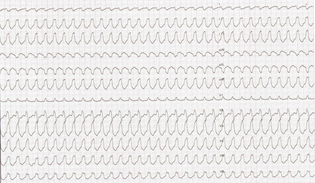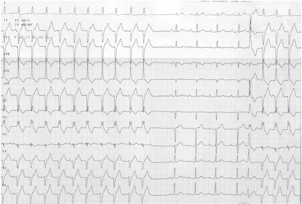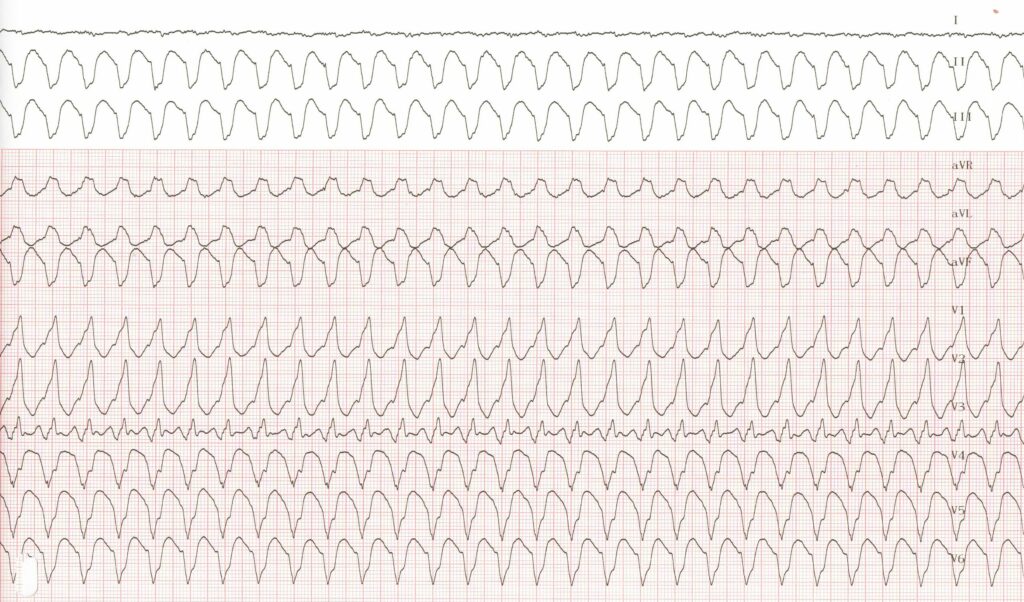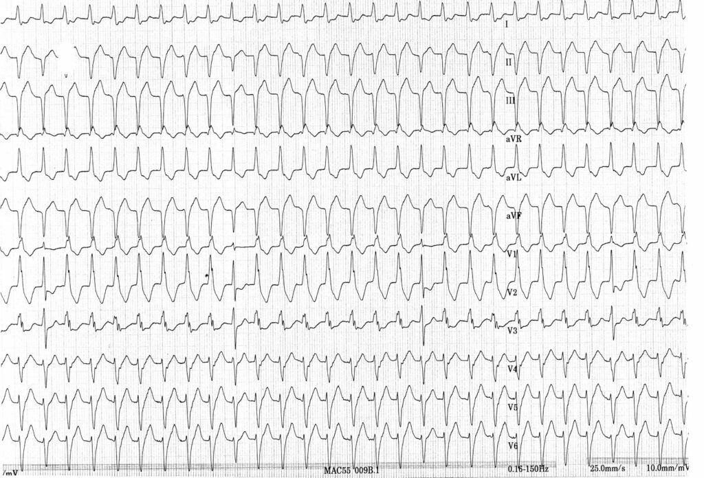 Patient de 76 ans avec myocardiopathie ischémique, implanté d’un défibrillateur présentant des récidives de tachycardie; sur ce premier tracé, on note une tachycardie à QRS large, l’activité atriale étant difficilement identifiable; la tachycardie est de type retard droit, axe gauche; l’aspect en V6 (en l’absence de tout traitement anti-arythmique) est très en faveur d’une tachycardie ventriculaire;