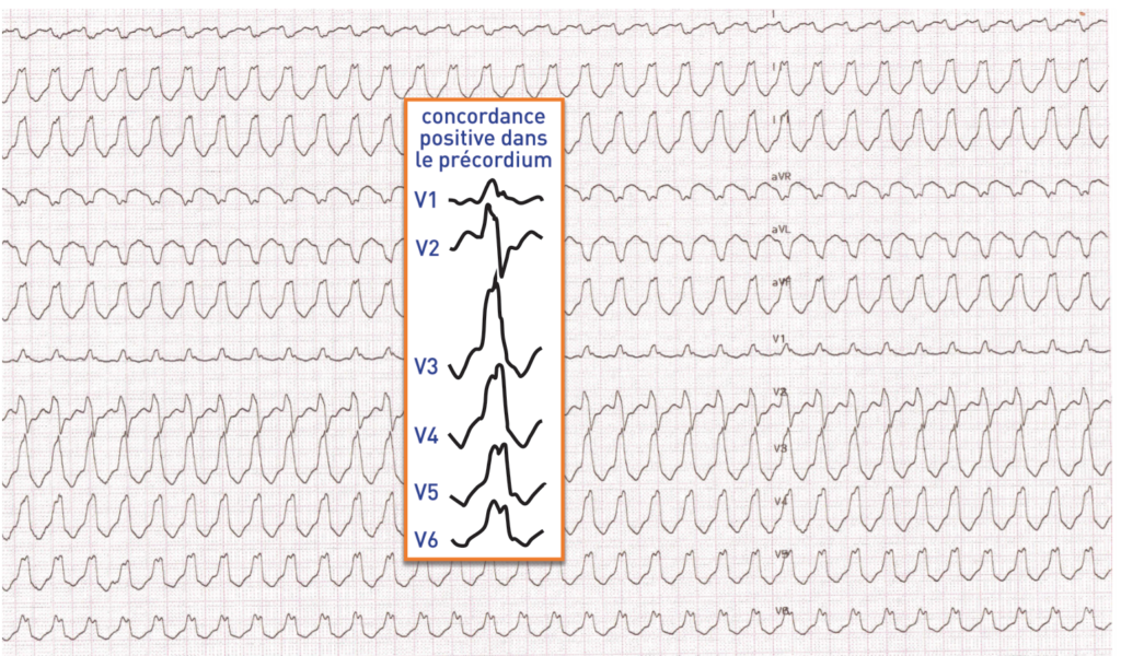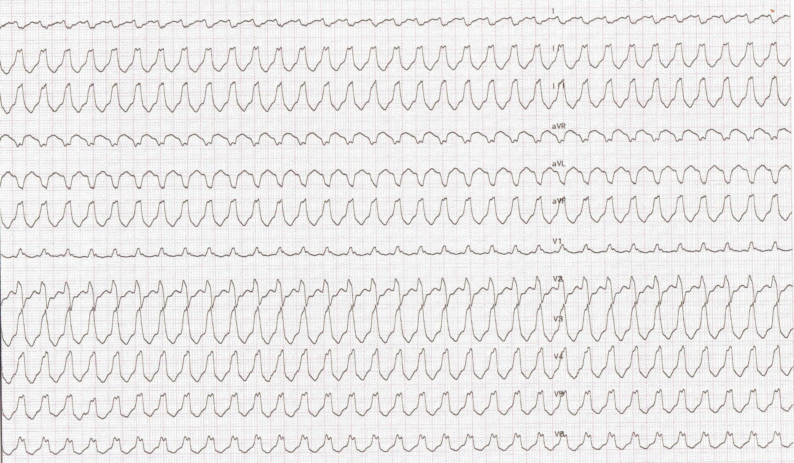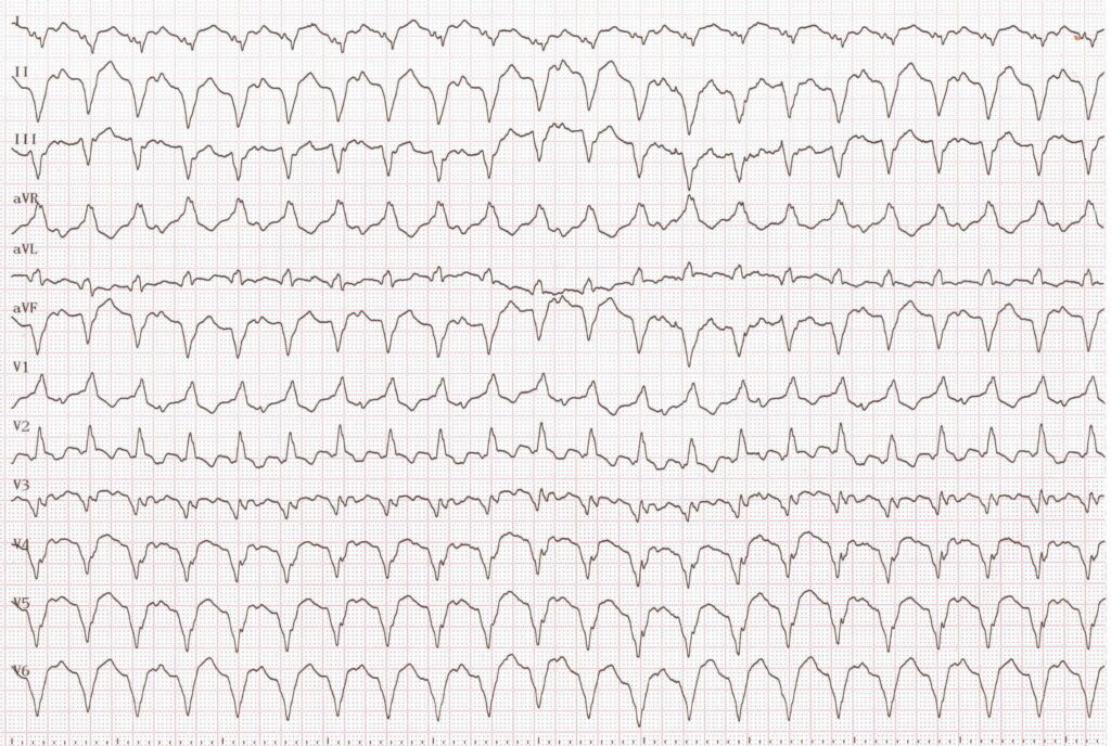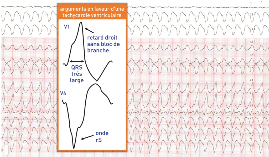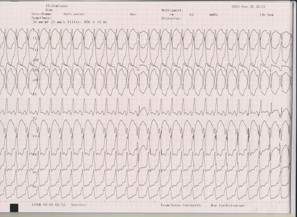 Patient de 69 ans avec myocardiopathie ischémique; tachycardie à QRS large, retard gauche, axe hyper-gauche (peu compatible avec une aberration de conduction) avec conduction rétrograde 2/1 (onde P’ négative dans les dérivations inférieures présente 1 QRS sur 2) confirmant le diagnostic de tachycardie ventriculaire;