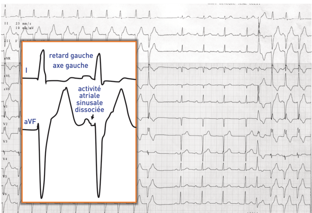 1) Une dissociation auriculo-ventriculaire avec activité atriale sinusale (tracé 2): il s’agit de la modalité la plus fréquente puisqu’observée dans 80 % des cas. Le diagnostic de tachycardie ventriculaire est alors très probable même si il faudra éliminer quelques diagnostics relativement rares (tachycardie hisienne ou nodale avec aberration ventriculaire et bloc rétrograde, tachycardie sur fibres de Mahaïm dans le sens antérograde et bloc nodal). Les ondes P sont complétement indépendantes des complexes QRS, sont d’origine sinusale (positive en DI, DII, négative en aVR), et ont souvent une fréquence relativement rapide (tachycardie sinusale réflexe à la suite de la baisse du débit cardiaque générée par la tachycardie ventriculaire). Le bloc responsable de la dissociation est habituellement nodal et fonctionnel même si il peut être organique et permanent (absence de conduction rétrograde possible). Ce bloc résulte de la collision des influx ascendant venant du ventricule et des influx descendant venant de l’oreillette et d’une conduction cachée interdisant le franchissement du nœud auriculo-ventriculaire en antérograde et en rétrograde. Il arrive parfois qu’une impulsion arrive à franchir la jonction auriculaire et active partiellement (complexe de fusion) ou totalement les ventricules (capture). La présence de captures ventriculaires ou de fusion est un critère formel de tachycardie ventriculaire. Une capture ventriculaire se traduit sur l’électrocardiogramme par un complexe QRS prématuré par rapport au cycle de la tachycardie, suivant une onde P sinusale avec un intervalle PR > 120 ms et reproduisant habituellement l’aspect du QRS sinusal. L’aspect peut être trompeur si une aberration de conduction se produit surtout si le bloc de branche est homolatéral par rapport au circuit de la tachycardie ventriculaire (complexe avec morphologie proche de celui de la tachycardie). Quand la capture est partielle (fusion), le complexe QRS a un aspect intermédiaire entre celui des complexes sinusaux et celui des complexes de la tachycardie.