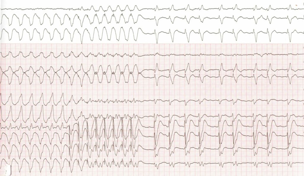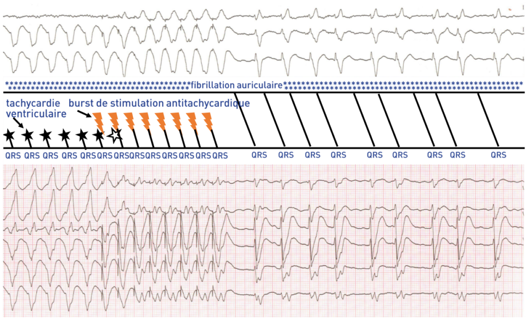 Le patient bénéficie d’un burst de stimulation antitachycardique délivré par le défibrillateur; il permet l’interruption de la tachycardie et met en évidence un QRS spontané très large (différent de celui en tachycardie) et une fibrillation auriculaire; ce patient présentait donc une bitachycardie (fibrillation auriculaire + tachycardie ventriculaire);