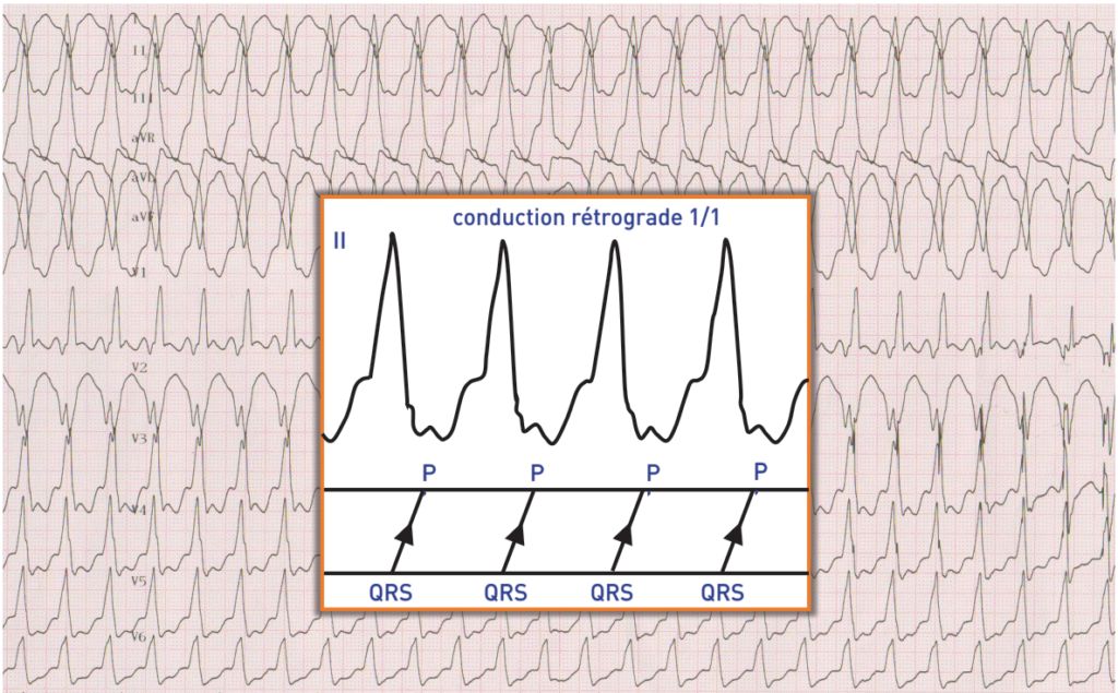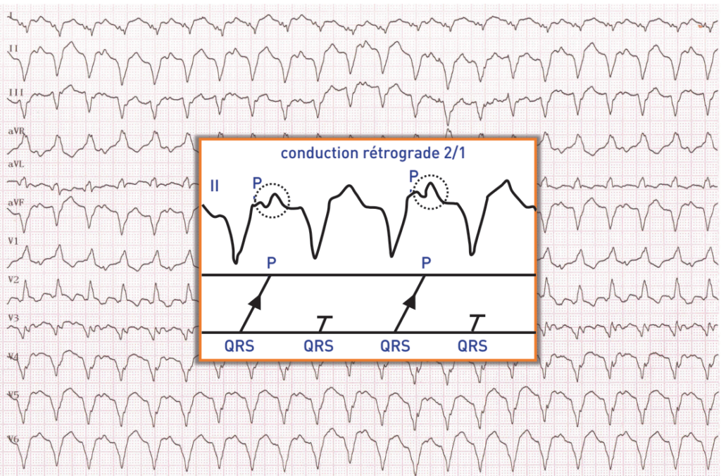Patient avec tétralogie de Fallot opérée; tachycardie à QRS large retard gauche avec conduction rétrograde 1/1 (onde P’ négative bien visualisable derrière chaque QRS en DII);