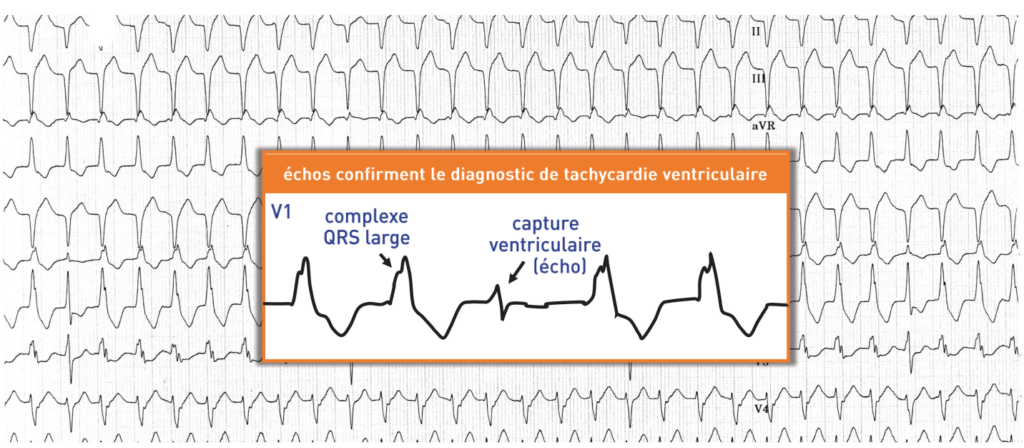 Homme de 24 ans sans antécédent cardiovasculaire; palpitations; tachycardie à QRS modérément élargis, retard droit, axe gauche; tachycardie fasciculaire bénigne; probable conduction rétrograde; on retrouve 3 échos sur ce tracé qui confirment le diagnostic de tachycardie ventriculaire: complexe QRS large, conduction rétrograde et capture ventriculaire (complexe légèrement prématuré par rapport au cycle de la tachycardie avec QRS fin);