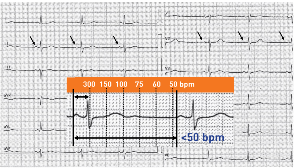 Ce patiente présente une bradycardie sinusale correspondant à une fréquence cardiaque inférieure à 50 ou 60 bpm (en fonction des définitions) au repos. La différence entre bradycardie physiologique et pathologique est parfois difficile à déterminer. En effet, une hypertonie vagale fréquemment observée chez les patients sportifs peut expliquer une bradycardie physiologique sans nécessité d’investigations particulières ou de traitement. Une étiologie médicamenteuse est également fréquemment observée (bétabloquant, digoxine, amiodarone, inhibiteur calcique…). Le caractère pathologique et la sanction thérapeutique (implantation d’un stimulateur) sont donc déterminés par l’existence de symptômes qui sont indispensables mais peuvent être plus ou moins sévères et plus ou moins spécifiques (syncopes, lipothymies, asthénie, vertiges). Une insuffisance chronotrope (définie par l’incapacité à atteindre une fréquence cardiaque à l’effort supérieure à 70, 80 ou 85% de la fréquence maximale théorique en fonction des définitions) peut s’accompagner de symptômes n’apparaissant qu’à l’effort (limitations des capacités d’effort, dyspnée d’effort).