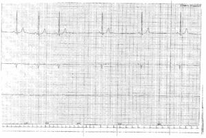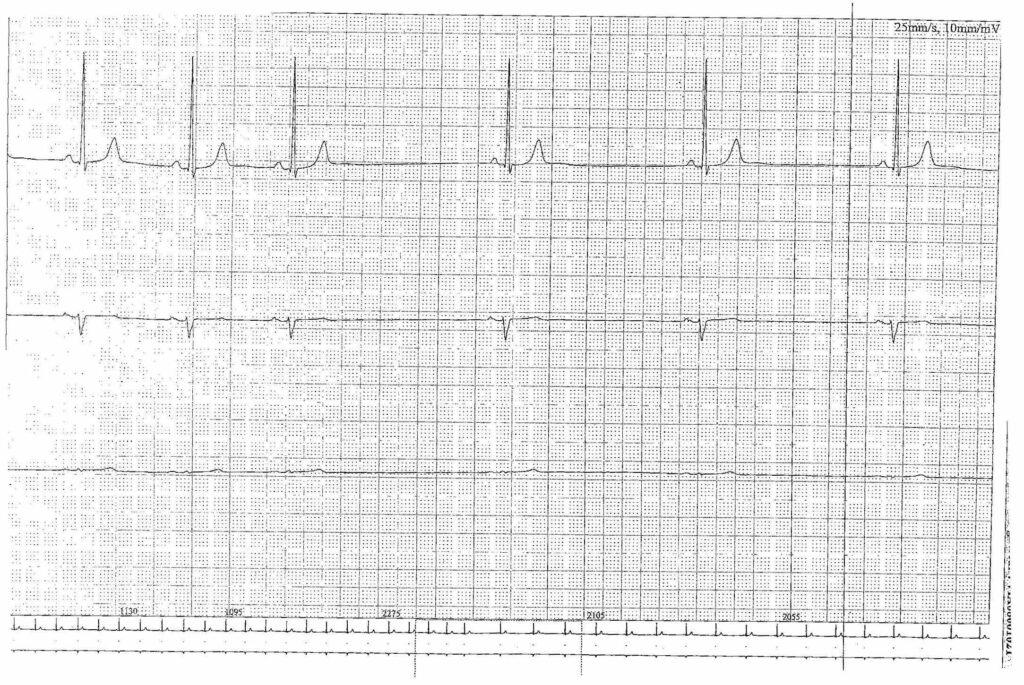 On retrouve initialement un rythme sinusal à 57 battements/minute avec une conduction atrio-ventriculaire normale (espace PR normal); on retrouve ensuite un ralentissement de la fréquence cardiaque avec bradycardie sinusale à 28 battements/minute;