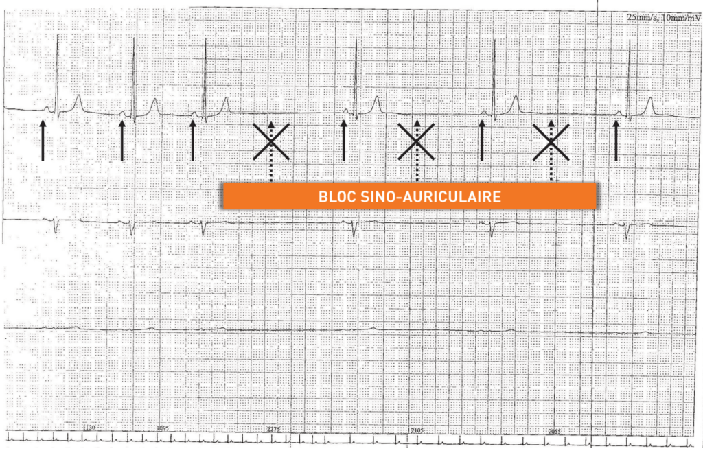 Le bloc sino-auriculaire du premier degré n’induit pas de bradycardie; le bloc sino-auriculaire du second degré type 2 est identifié grâce à la présence de pauses sinusales d’une durée égale à un multiple du cycle de base; dans le bloc sino-auriculaire du troisième degré, aucune activité sinusale n’est identifiable.