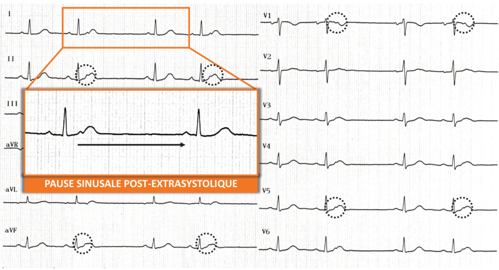 Ce patient était donc adressé dans le cadre d’une irrégularité de fréquence et de pauses sinusales. Une inspection minutieuse du tracé permet de mettre en évidence une encoche dans l’onde T précédant la pause correspondant à une extrasystole atriale bloquée expliquant la pause post-extrasystolique qui suit. Il ne s’agit donc pas d’un problème de baisse de l’automatisme (dysfonction sinusale et discussion sur l’intérêt d’implantation d’un stimulateur cardiaque) mais au contraire d’un hyper- automatisme (extrasystole atriale et discussion sur l’intérêt d’un traitement anti- arythmique). Une extrasystole atriale bloquée constitue donc le diagnostic différentiel de dysfonction sinusale qui doit être systématiquement recherché devant l’existence d’une pause, les conséquences thérapeutiques étant opposées.