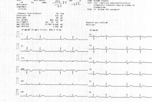 Ce patient présente une activité atriale sinusale (positive en DI, DII, V5, V6 et négative en aVR); on peut voir dans la partie initiale de l’onde T, une activité atriale ectopique correspondant à une extrasystole atriale bloquée (non suivie d’un QRS) avec pause sinusale post-extrasystolique expliquant la pseudo-bradycardie sinusale;