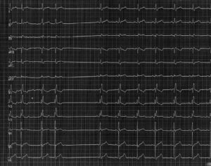 Homme de 74 ans présentant des syncopes répétées avec sensation de palpitations précé dant la perte de connaissance. Enregistrement d’un tracé lors de la survenue de palpitations.