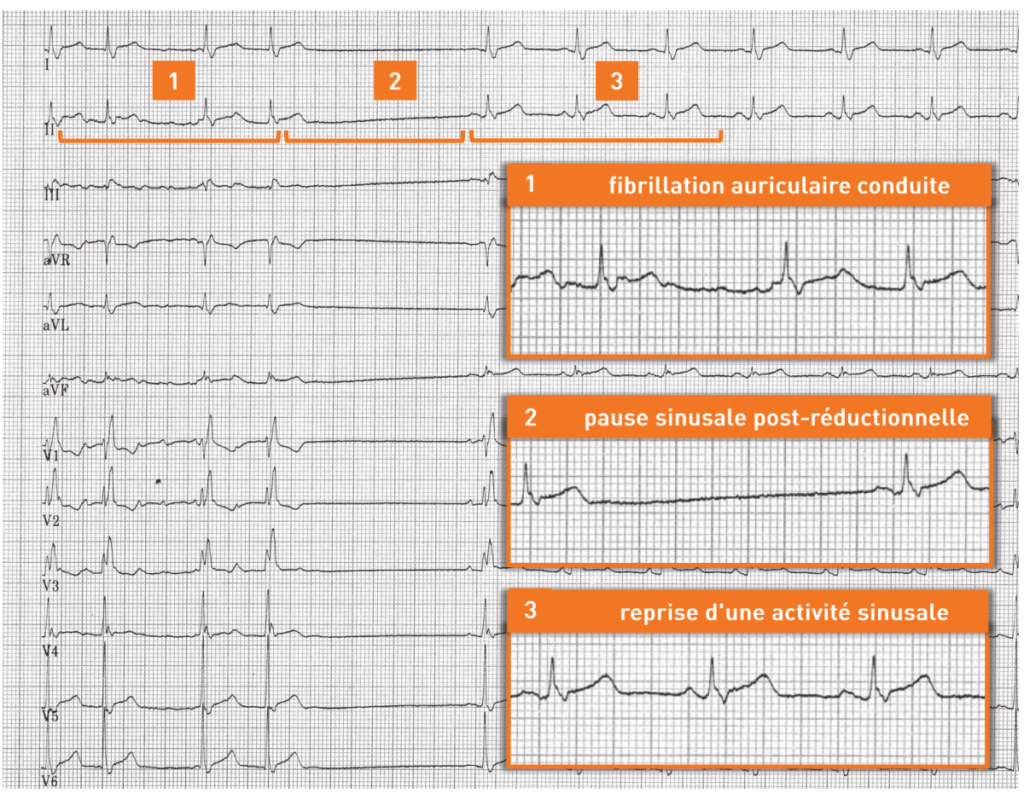 Au début du tracé, l’activité atriale est irrégulière, très rapide, anarchique et correspond à une FA conduite avec bloc de branche droit complet (QRS > 120 ms, aspect rsR’ en V1, onde S large et trainante en V6); l’arythmie atriale se réduit avec mise en évidence d’une pause sinusale post- réductionnelle de plus de 2 secondes; reprise d’une activité sinusale normale avec le même aspect de bloc de branche droit.