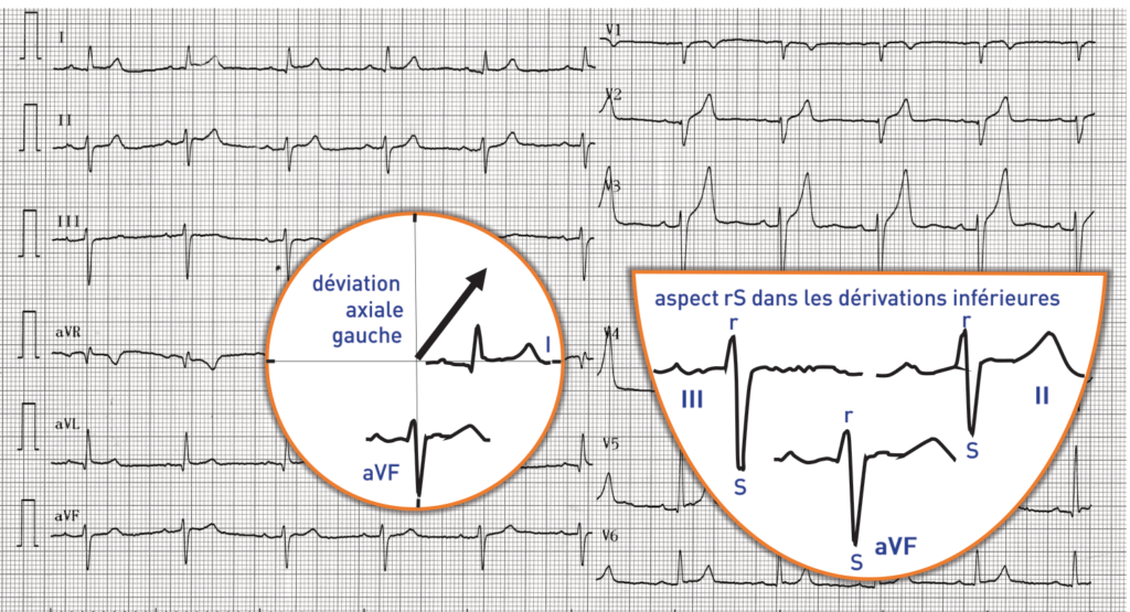 Activité sinusale; PR normal, QRS fin; hémibloc antérieur gauche: axe gauche, aspect rS dans les dérivations inférieures, aspect qR en DI, aVL, onde R plus précoce en aVR qu’en aVL, onde q en V1-V2;