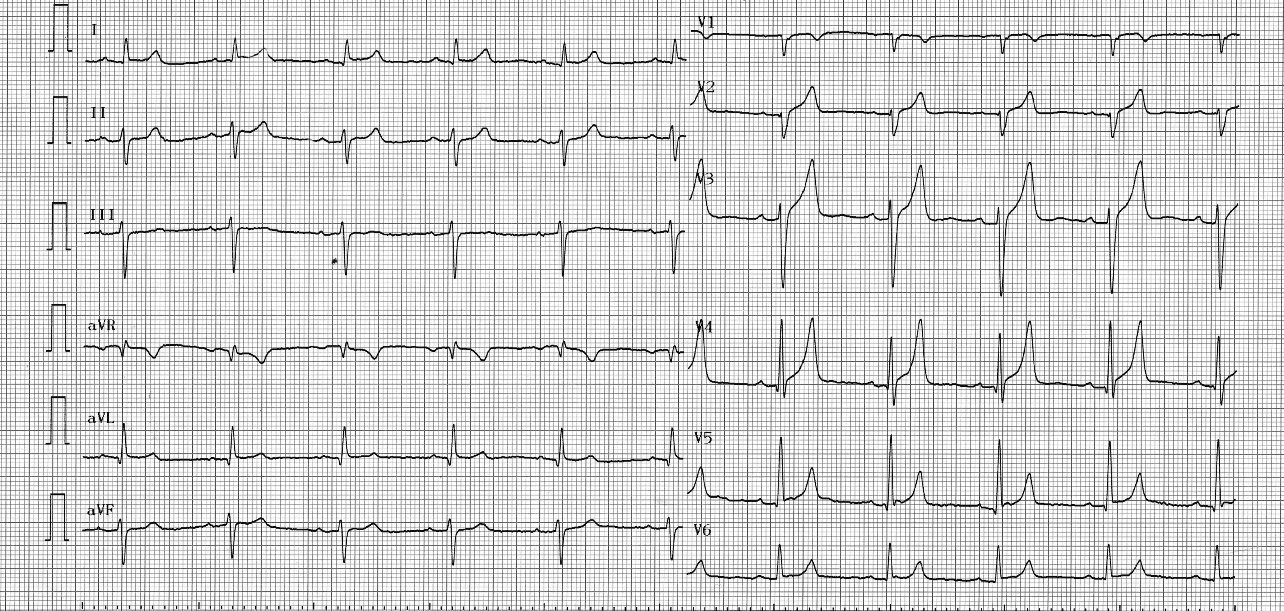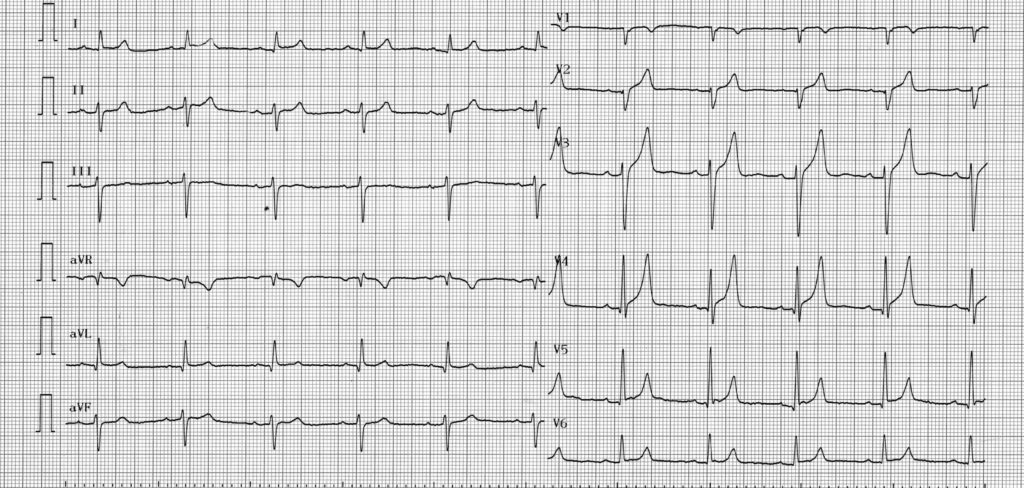 Activité sinusale; PR normal, QRS fin; hémibloc antérieur gauche: axe gauche, aspect rS dans les dérivations inférieures, aspect qR en DI, aVL, onde R plus précoce en aVR qu’en aVL, onde q en V1-V2;