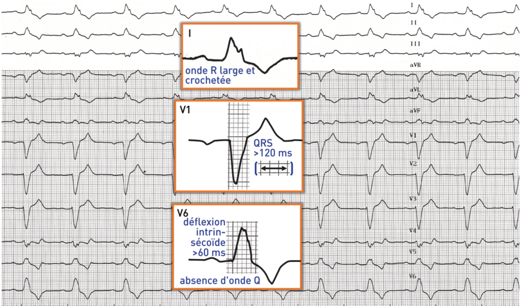 1. Un complexe QRS élargi à 120 ms ou plus chez l’adulte, un QRS supérieur à 100 ms chez l’enfant de moins de 8 ans ;