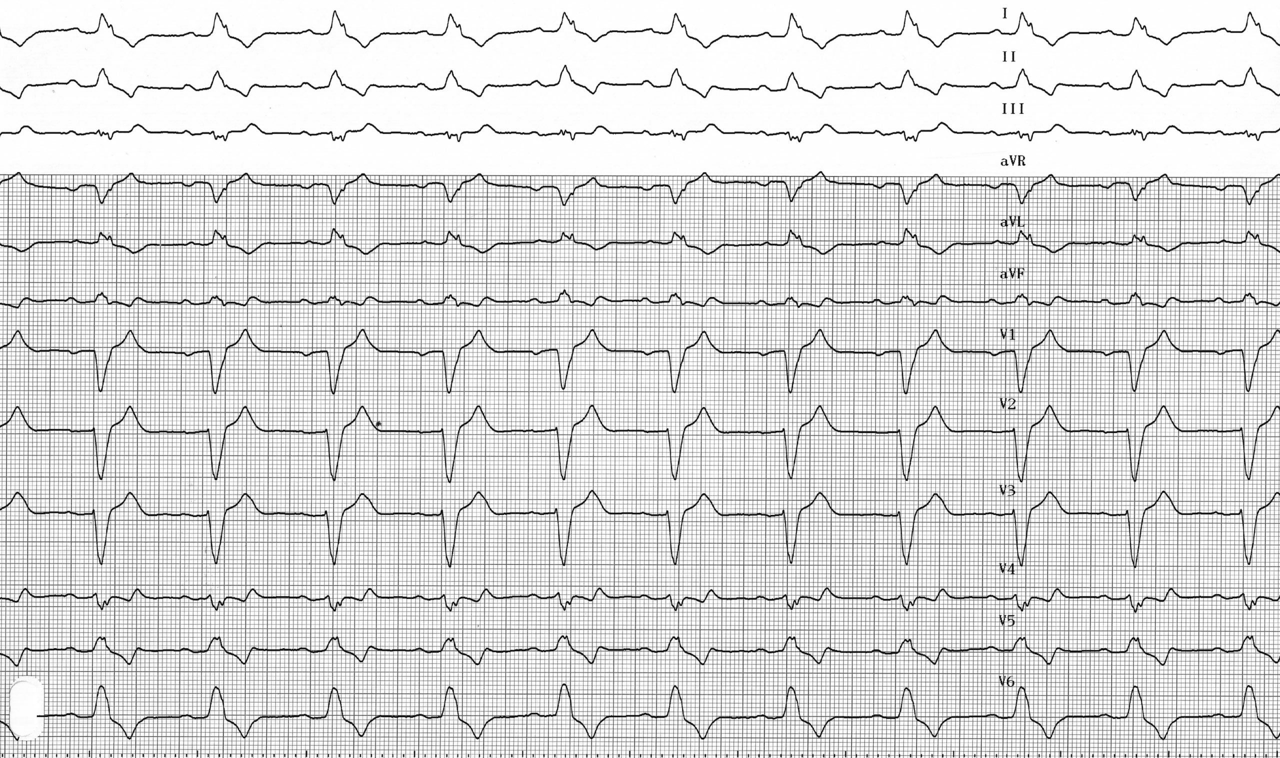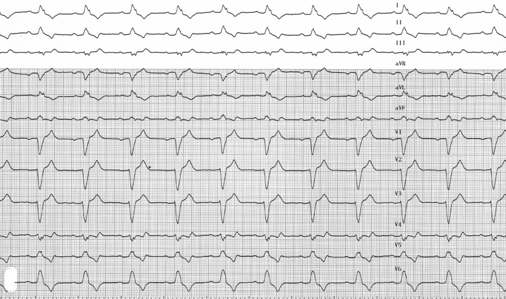 Rythme sinusal, hypertrophie auriculaire gauche (onde P élargie et fragmentée); bloc de branche gauche: largeur du QRS > 120 ms; absence d’onde q et onde R large et crochetée en DI, aVL, V5 et V6 avec retard de la déflexion intrinsécoïde > 60 ms; aspect QS et rS en V1 et V2; sous-décalage segment ST et onde T négative en DI, aVL, V5 et V6