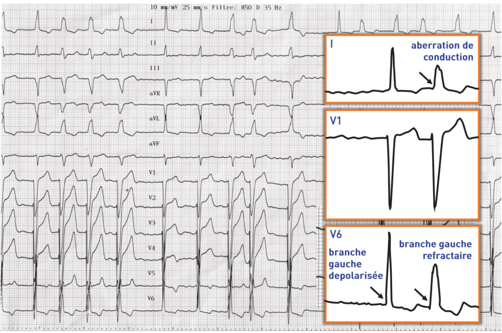 Ce tracé montre un bloc de branche gauche fonctionnel fréquence-dépendant (qui apparaît au-delà d’une fréquence cardiaque donnée). Cette aberration de conduction apparait quand un influx d’origine supraventriculaire survient alors que la branche gauche est encore en période réfractaire.