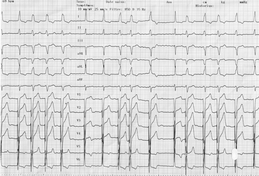 Ce tracé montre un bloc de branche gauche fonctionnel fréquence-dépendant (qui apparaît au-delà d’une fréquence cardiaque donnée). Cette aberration de conduction apparait quand un influx d’origine supraventriculaire survient alors que la branche gauche est encore en période réfractaire.