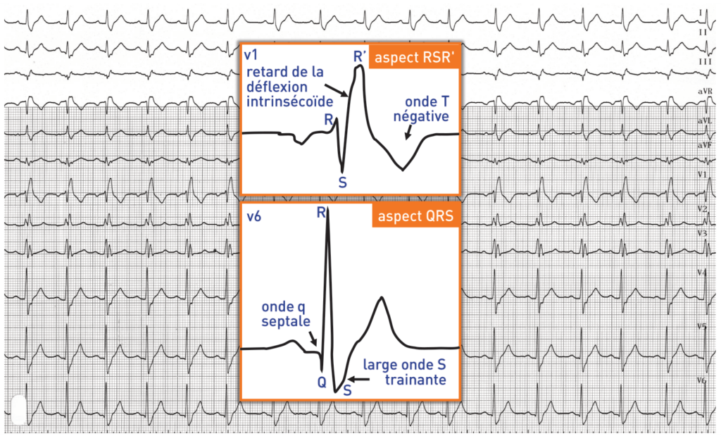 4) un aspect caractéristique en V6 : on peut retrouver une onde q de dépolarisation septale normale (elle peut être absente en fonction des différences de morphologie et d’orientation du coeur) et une onde S large et trainante correspondant à la dépolarisation tardive du septum droit et de la cavité ventriculaire droite ;