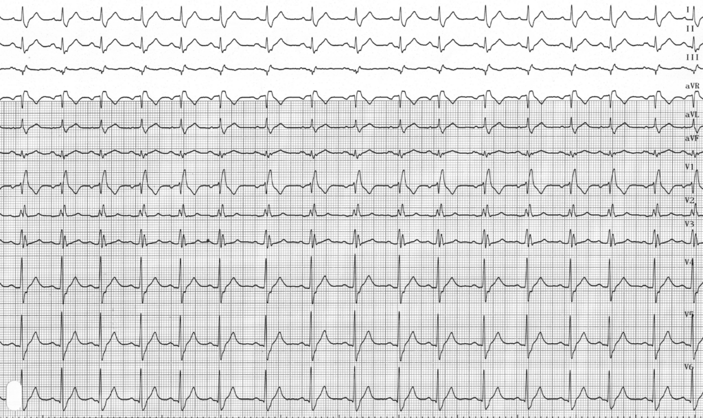 1) un complexe QRS élargi à 120 ms ou plus chez l’adulte, un QRS supérieur à 100 ms chez l’enfant de moins de 8 ans ;