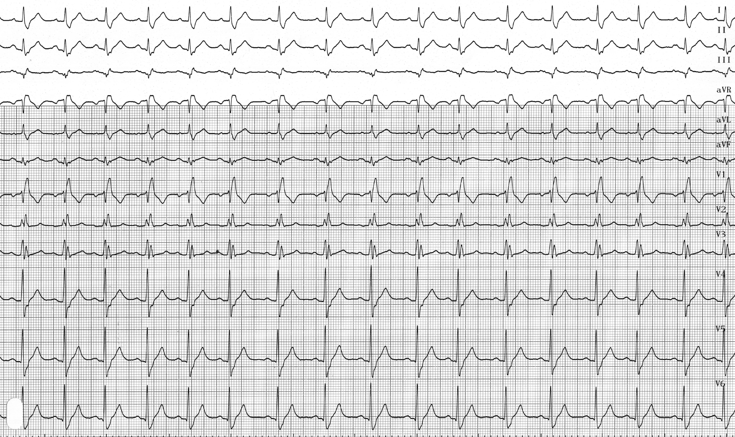 5) une modification du segment ST et de l‘onde T en V1, V2 : on peut observer un segment ST sous-décalé et une onde T inversée ; la dépolarisation étant modifiée, il existe en réponse des troubles de la repolarisation ; onde T positive en V6 ;