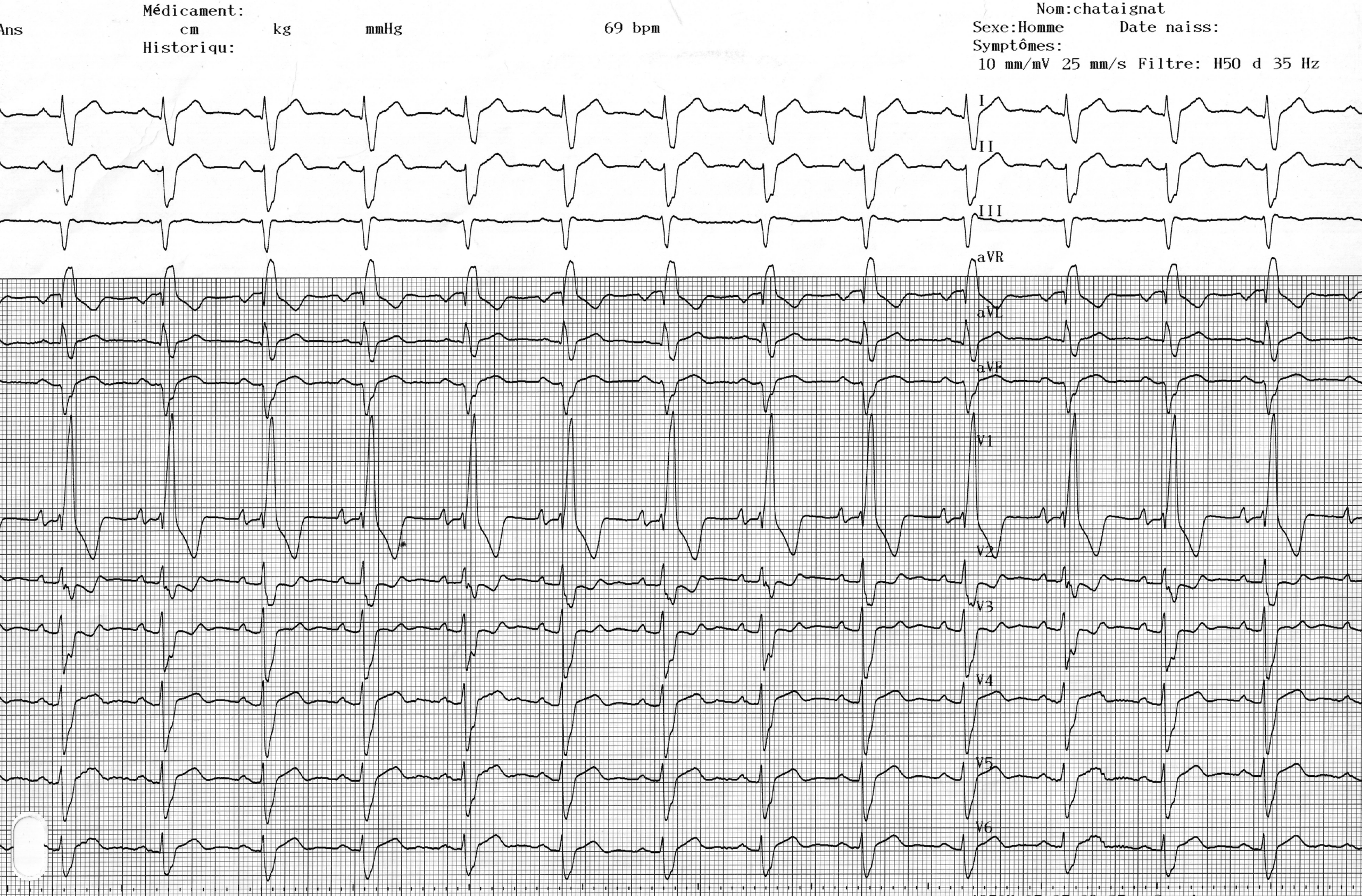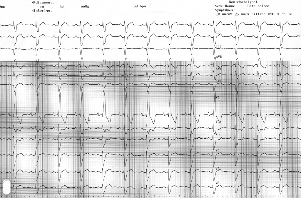 Activité atriale sinusale, espace PR normal (190 ms), aspect de bloc de branche droit complet (durée du QRS 180 ms, aspect rsR’ en V1) avec hypertrophie ventriculaire droite (grande amplitude de l’onde R’ en V1, onde S très profonde et large en D1, V5, V6, retard marqué de la déflexion intrinsécoïde en V1, troubles de la repolarisation de V1 à V3);