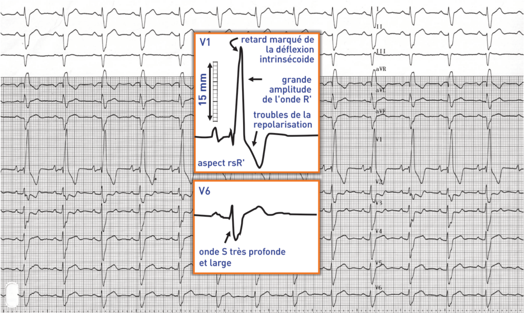 Le diagnostic électrique d’hypertrophie ventriculaire droite est difficile à affirmer en présence d’un bloc de branche droit et ne s’exprime que si l’hypertrophie est anatomiquement marquée.