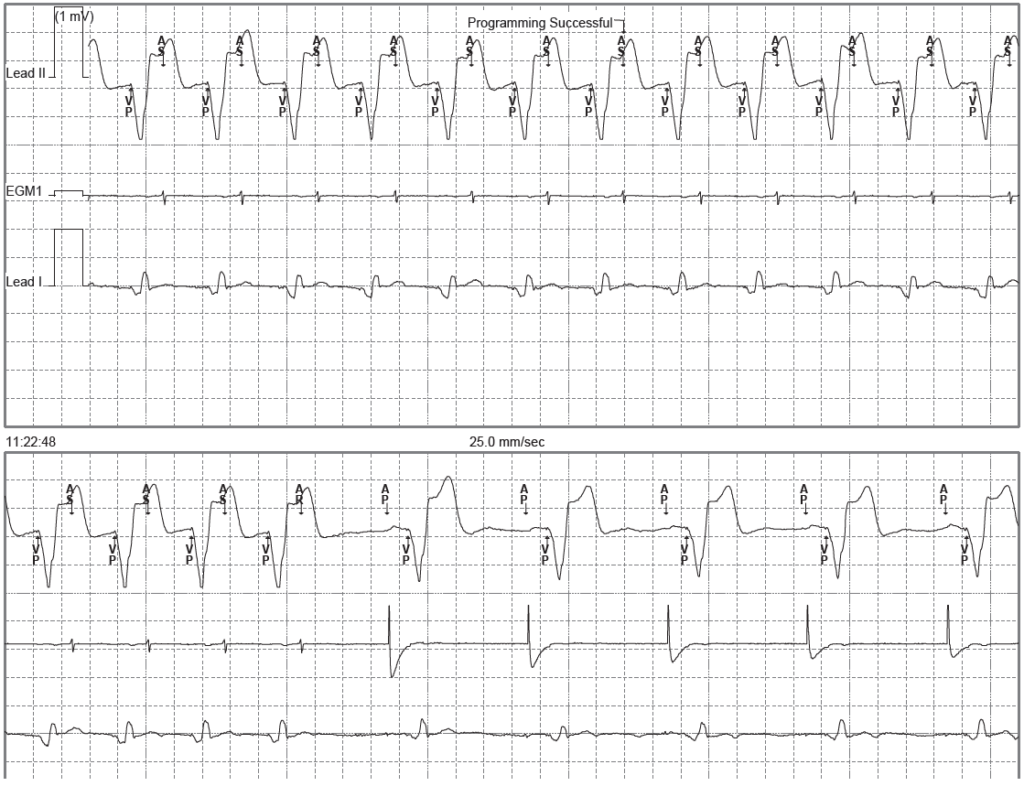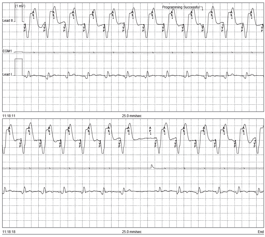 L’analyse de l’EGM permet d’établir le diagnostic; initialement, on retrouve une TRE; programmation de l’algorithme d’interruption des TRE (programming successfull); diagnostic de TRE porté par l’appareil après 8 cycles consécutifs VP-AS; intervention de l’algorithme d’interruption des TRE avec allongement de la période réfractaire atriale post-ventriculaire à 400 ms sur un cycle; l’activité atriale est détectée dans la PRAPV (AR) et ne synchronise pas de stimulation ventriculaire; la stimulation atriale qui suit est inefficace favorisant la conduction rétrograde et la tachycardie redémarre;