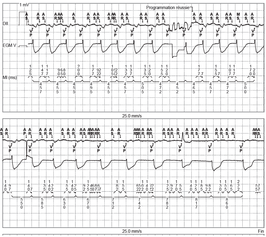 Le ralentissement de la fréquence de stimulation permet la réapparition du rythme spontané; l’allongement des diastoles ventriculaires permet de mieux visualiser la détection d’une arythmie atriale rapide et désorganisée; la stimulation ventriculaire ne survient plus que sur les quelques diastoles longues (FA lente);